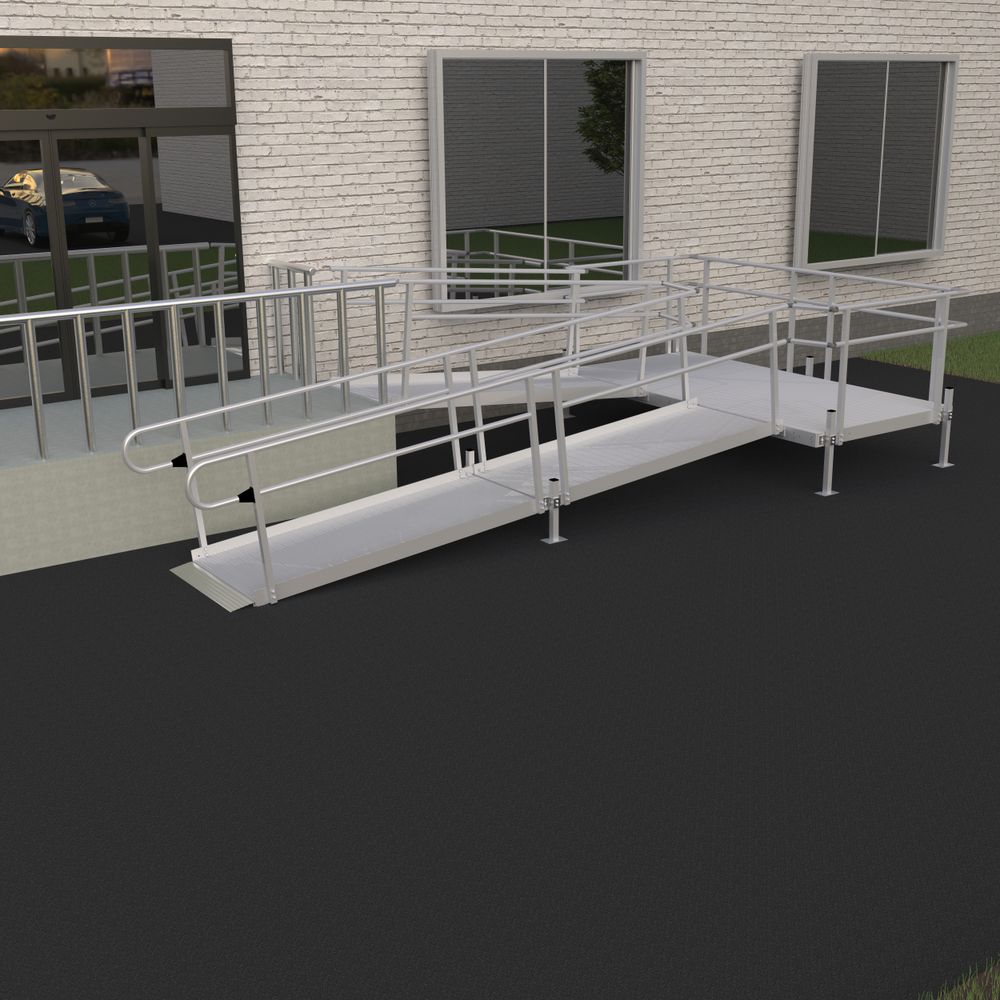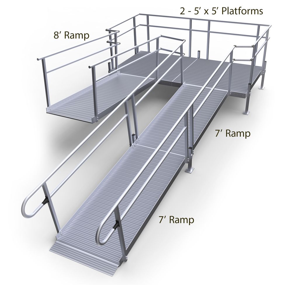 Features a 8' upper ramp, two 5' x 5' turning platforms, and two 7' lower ramp sections with support stands. The handrails on both sides of the full length of the ramp, as well as on the platforms, allow pedestrians to support and aid themselves as they walk up or down the ramp. A low gradient, non-slip surface enhances accessibility at your home for both pedestrians and those who use mobility aids.