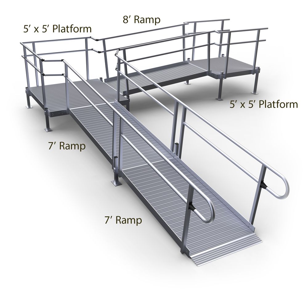 Featuring a 5' x 5' top platform, a 8' middle ramp, a 5' x 5' turning platform, and two 7' lower ramp section with support stands. This all-in-one ramp kit can be installed on the left or right side of turning, depending on the configuration needs of your location. Smooth, looped double handrails and a low-gradient, non-slip ramp enables comfortable accessibility, whether you use a mobility device or simply have limited mobility.