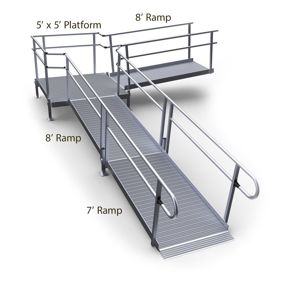 Featuring a 8' upper ramp, a 5' x 5' turning platform, and one 8' and one 7' lower ramp sections with support stands. This all-in-one ramp kit can be installed on the left or right side of turning, depending on the configuration needs of your location. The turning platform serves as a landing or rest area. Smooth, looped double handrails and a low-gradient, non-slip ramp enables comfortable accessibility, whether you use a mobility device or simply have limited mobility.