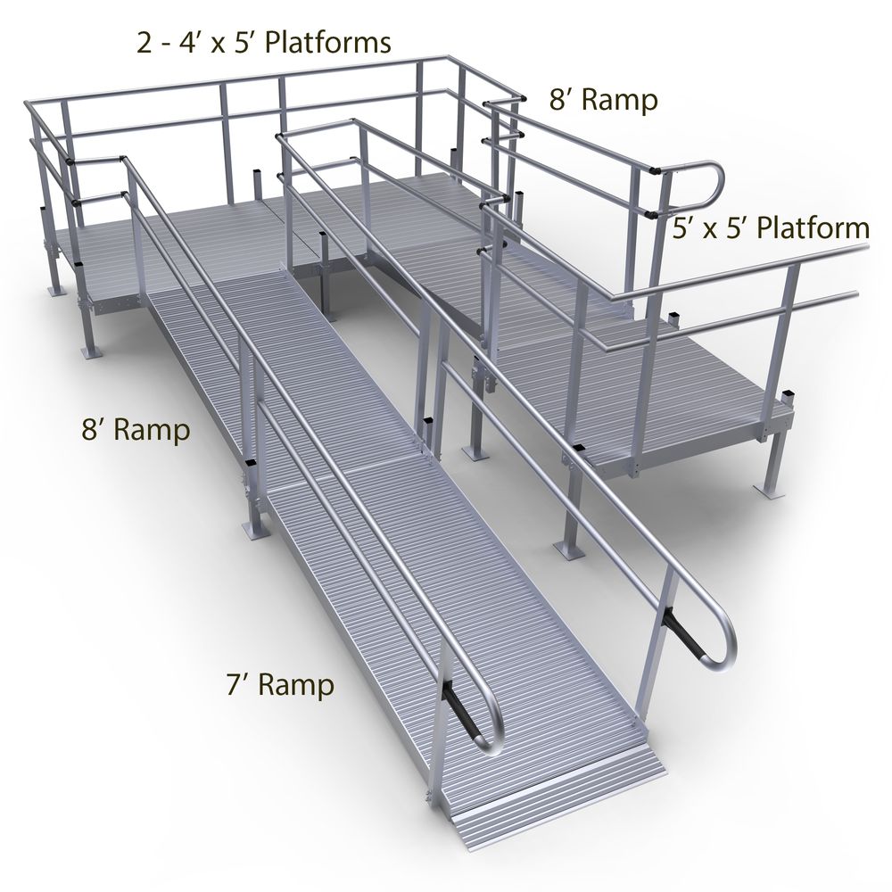 Features a 5' x 5' top platform, 8' upper ramp, two 4' x 5' turning platforms, and one 8' and one 7' lower ramp sections with support stands. Handrails on both sides of the full length of the ramp, as well as on the platforms, allow pedestrians to support and aid themselves as they walk up or down the ramp. A low gradient, non-slip surface enhances accessibility at your home for both pedestrians and those who use mobility aids.
