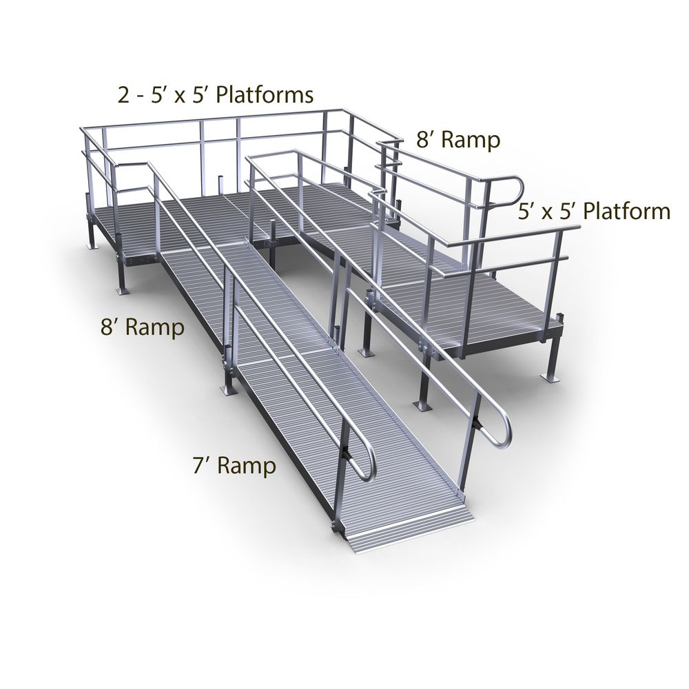 Features a 5' x 5' top platform, 8' upper ramp, two 5' x 5' turning platforms, and one 8' and one 7' lower ramp sections with support stands. Handrails on both sides of the full length of the ramp, as well as on the platforms, allow pedestrians to support and aid themselves as they walk up or down the ramp. A low gradient, non-slip surface enhances accessibility at your home for both pedestrians and those who use mobility aids.