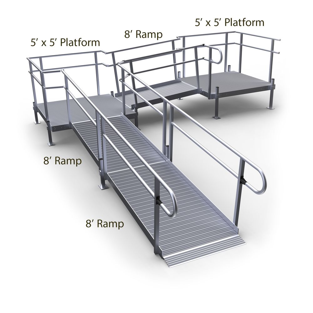 Featuring a 5' x 5' top platform, a 8' middle ramp, a 5' x 5' turning platform, and two 5' lower ramp sections with support stands. The lower ramp section installs on the turning platform on either the left or right side at 90-degrees from the lower ramp sections. Smooth, continuous handrails and a low gradient offer easy accessibility to your home, whether you're walking or using a wheelchair or other mobility device.