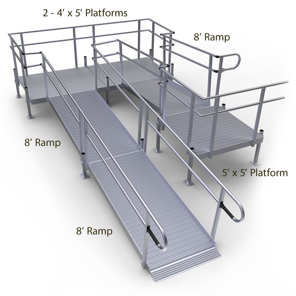 Features a 5' x 5' top platform, 8' upper ramp, two 4' x 5' turning platforms, and two 8' lower ramp sections with support stands. Handrails on both sides of the full length of the ramp, as well as on the platforms, allow pedestrians to support and aid themselves as they walk up or down the ramp. A low gradient, non-slip surface enhances accessibility at your home for both pedestrians and those who use mobility aids.