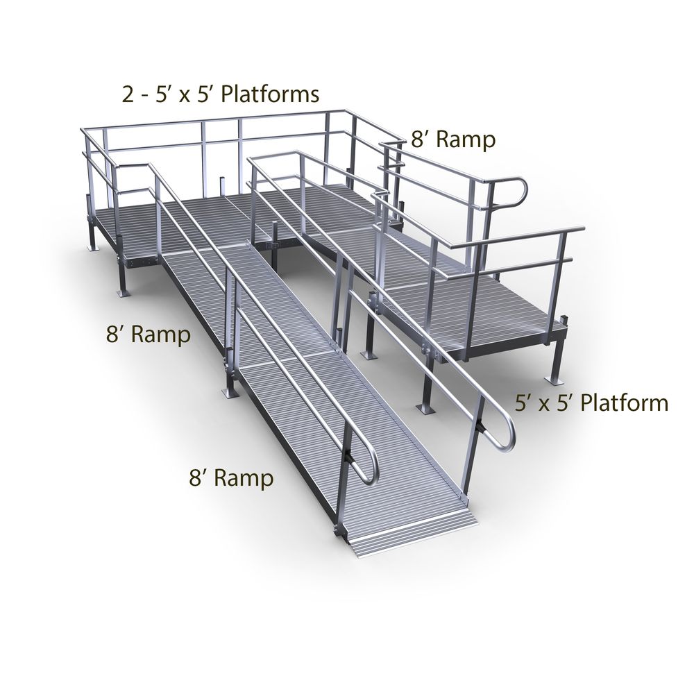 Features a 5' x 5' top platform, 8' upper ramp, two 5' x 5' turning platforms, and two 8' lower ramp sections with support stands. Handrails on both sides of the full length of the ramp, as well as on the platforms, allow pedestrians to support and aid themselves as they walk up or down the ramp. A low gradient, non-slip surface enhances accessibility at your home for both pedestrians and those who use mobility aids.