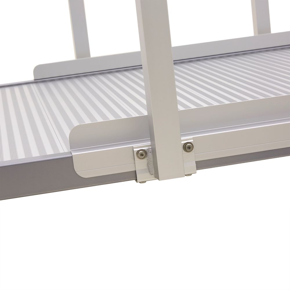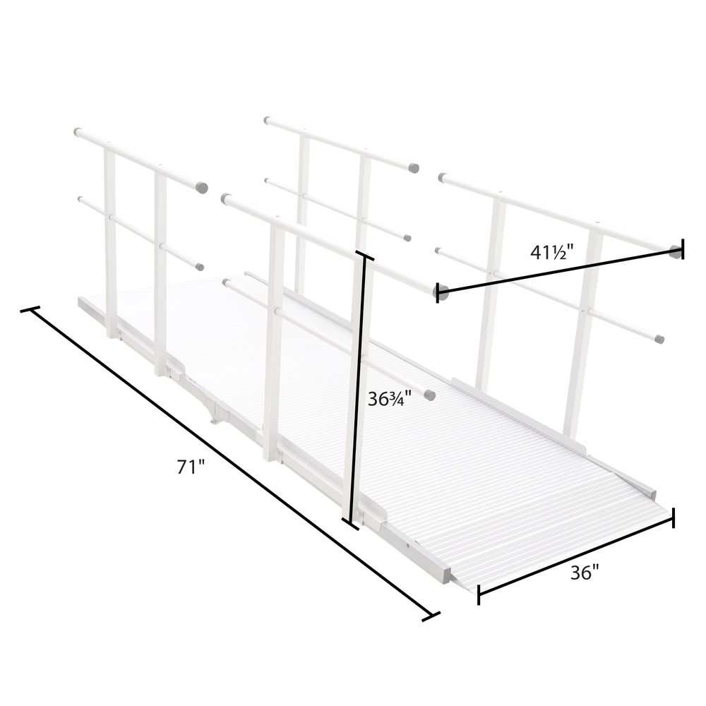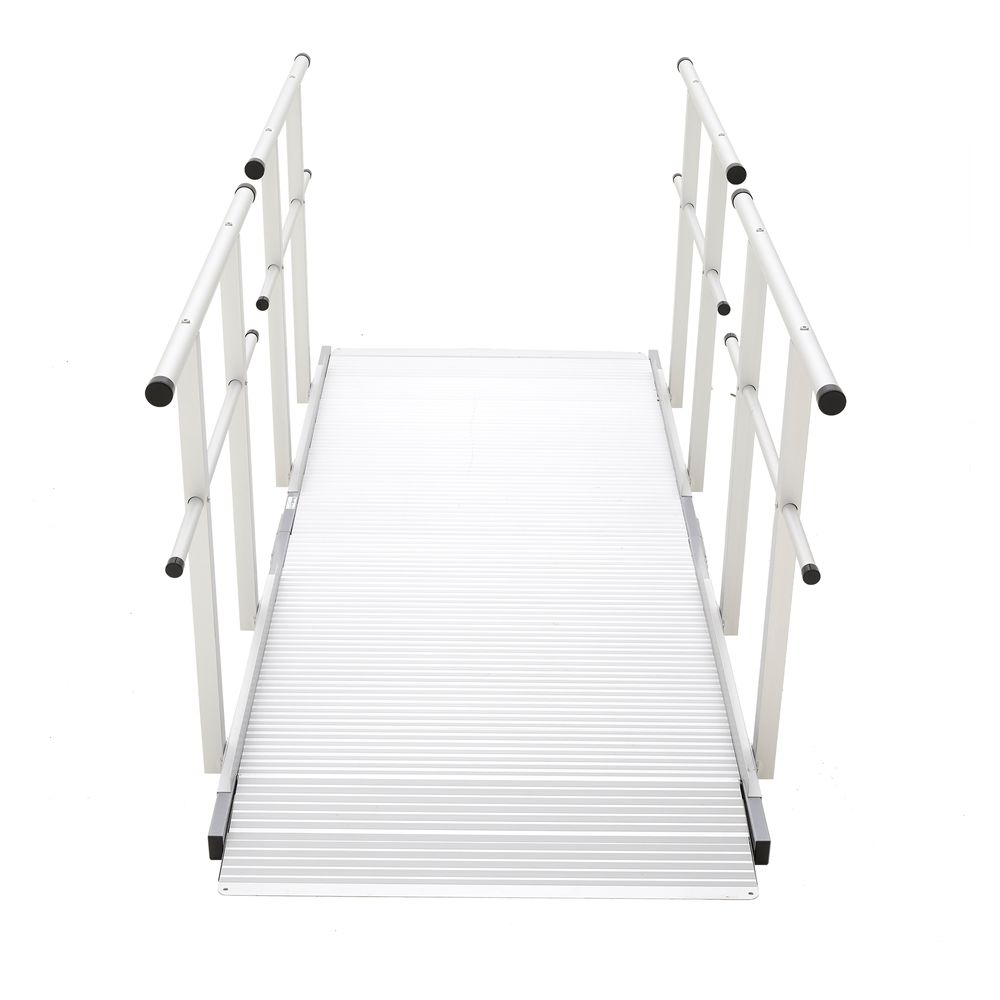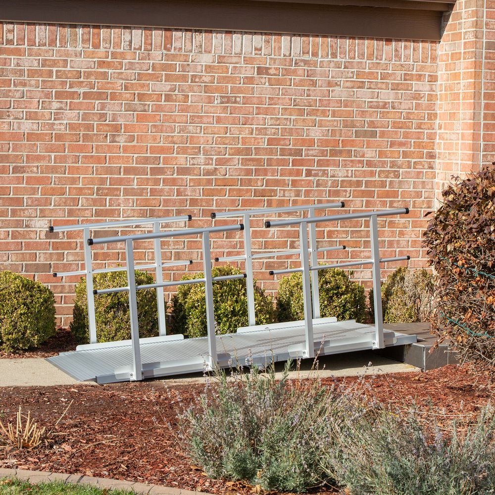 The lightweight, high-strength aluminum construction is paired with a slip-resistant surface texture, ensuring that this ramp is weatherproof and durable for years of maintenance-free use. The two-level handrails accommodate adults and children who walk by themselves or assisted, in addition to individuals in manual or electric wheelchairs or scooters.