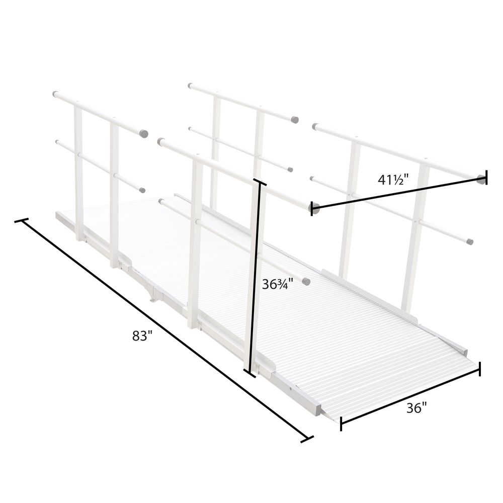 The lightweight, high-strength aluminum construction is paired with a slip-resistant surface texture, ensuring that this ramp is weatherproof and durable for years of maintenance-free use. The two-level handrails accommodate adults and children who walk by themselves or assisted, in addition to individuals in manual or electric wheelchairs or scooters.