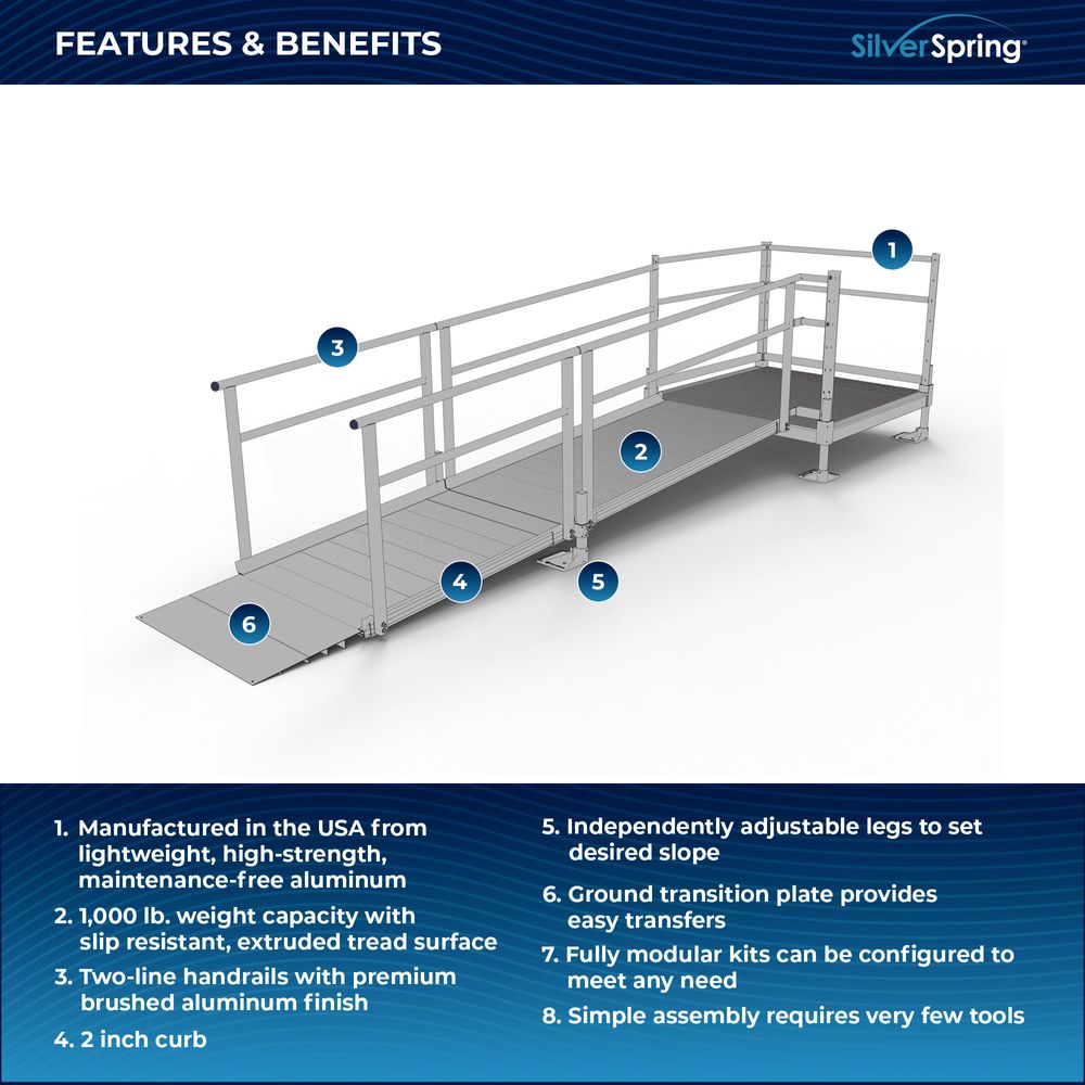 Because of the simple design, each ramp and platform can be moved or repositioned to create any number of configurations. The handrails are engineered to install in such a way that you can set up a straight, left or right entryway to your ramp. You can also install it without a platform, install it with one less ramp and more. It’s all possible with the configurability of the Silver Spring Modular Ramp System.