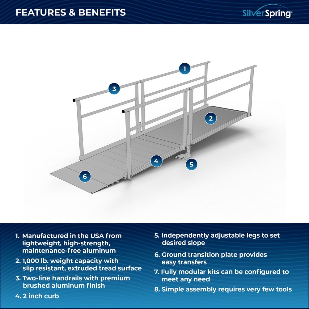 Built for easy setup, the Silver Spring Clearway Modular Ramp System ships rapidly and assembles with fewer tools than other modular systems. Manufactured in the United States from high-strength, lightweight aluminum that will never rust or require painting, it includes everything you need for installation straight out of the box. Use it to overcome rises with a slope range from 1:6 to 1:14, perfect for home entryways and similar residential applications.