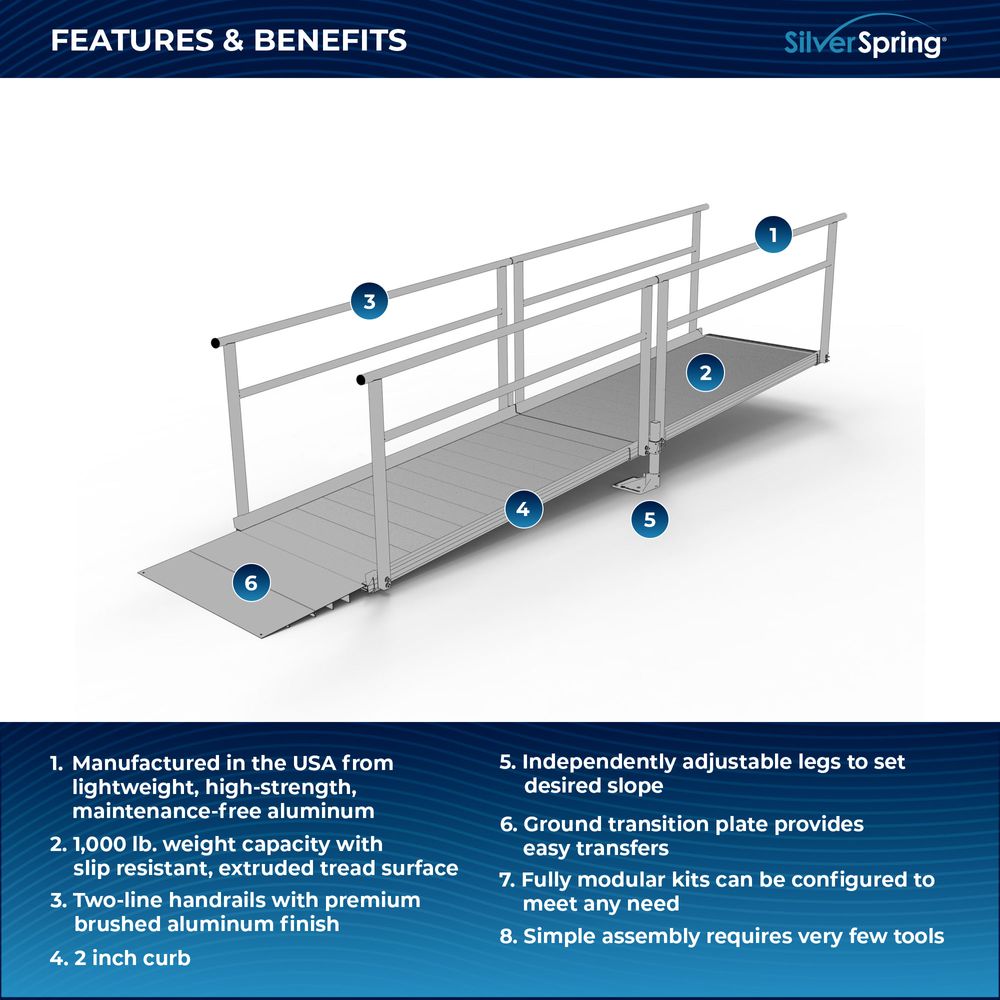 Built for easy setup, the Silver Spring Clearway Modular Ramp System ships rapidly and assembles with fewer tools than other modular systems. Manufactured in the United States from high-strength, lightweight aluminum that will never rust or require painting, it includes everything you need for installation straight out of the box. Use it to overcome rises with a slope range from 1:6 to 1:14, perfect for home entryways and similar residential applications.