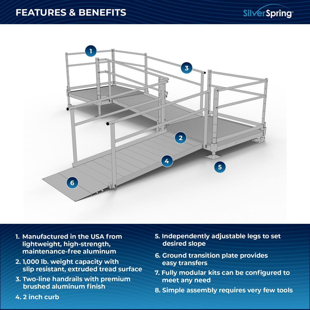 Built for easy setup, the Silver Spring Clearway Modular Ramp System ships rapidly and assembles with fewer tools than other modular systems. Manufactured in the United States from high-strength, lightweight aluminum that will never rust or require painting, it includes everything you need for installation straight out of the box. Use it to overcome rises with a slope range from 1:6 to 1:14, perfect for home entryways and similar residential applications.