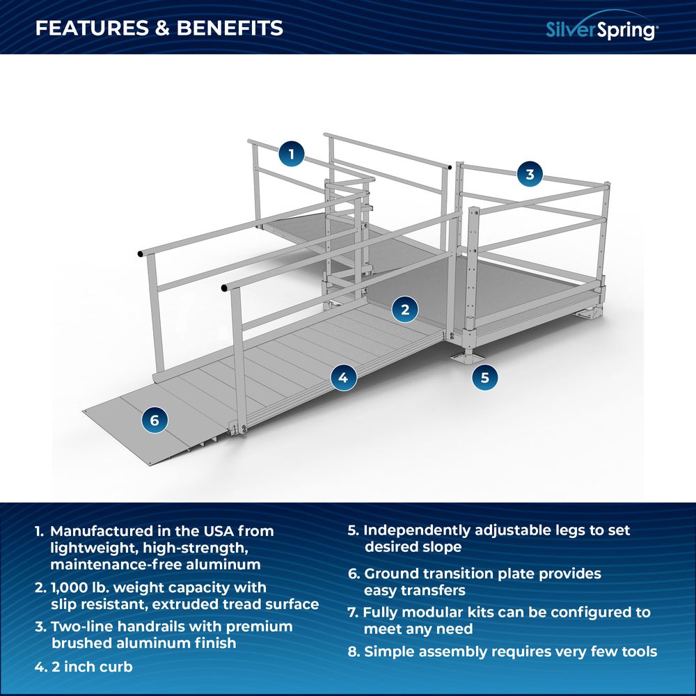 Because of the simple design, each ramp and platform can be moved or repositioned to create any number of configurations. The handrails are engineered to install in such a way that you can set up a straight, left or right entryway to your ramp. You can also install it without a platform, install it with one less ramp and more. It’s all possible with the configurability of the Silver Spring Modular Ramp System.