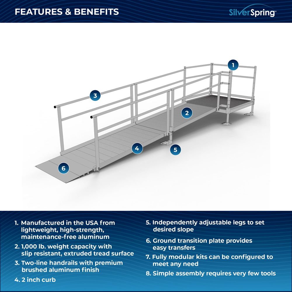 Built for easy setup, the Silver Spring Clearway Modular Ramp System ships rapidly and assembles with fewer tools than other modular systems. Manufactured in the United States from high-strength, lightweight aluminum that will never rust or require painting, it includes everything you need for installation straight out of the box. Use it to overcome rises with a slope range from 1:6 to 1:14, perfect for home entryways and similar residential applications.