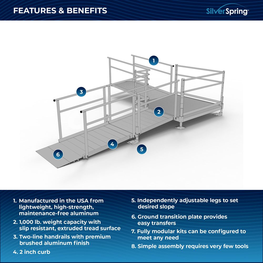 Because of the simple design, each ramp and platform can be moved or repositioned to create any number of configurations. The handrails are engineered to install in such a way that you can set up a straight, left or right entryway to your ramp. You can also install it without a platform, install it with one less ramp and more. It’s all possible with the configurability of the Silver Spring Modular Ramp System.