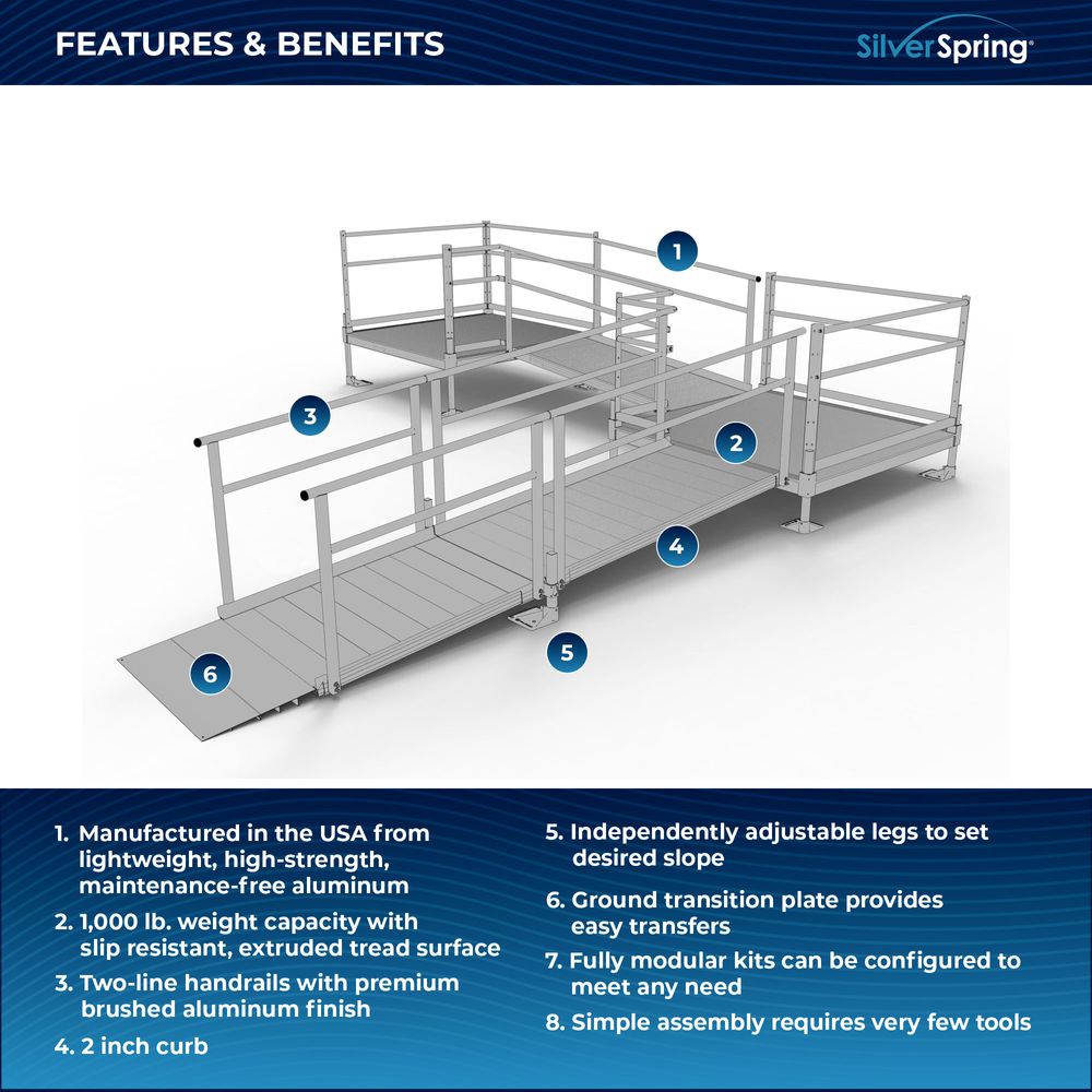 Because of the simple design, each ramp and platform can be moved or repositioned to create any number of configurations. The handrails are engineered to install in such a way that you can set up a straight, left or right entryway to your ramp. You can also install it without a platform, install it with one less ramp and more. It’s all possible with the configurability of the Silver Spring Modular Ramp System.