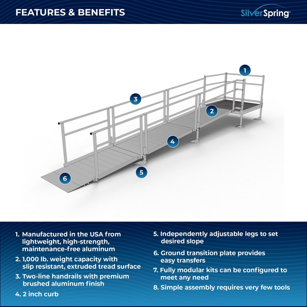 Built for easy setup, the Silver Spring Clearway Modular Ramp System ships rapidly and assembles with fewer tools than other modular systems. Manufactured in the United States from high-strength, lightweight aluminum that will never rust or require painting, it includes everything you need for installation straight out of the box. Use it to overcome rises with a slope range from 1:6 to 1:14, perfect for home entryways and similar residential applications.