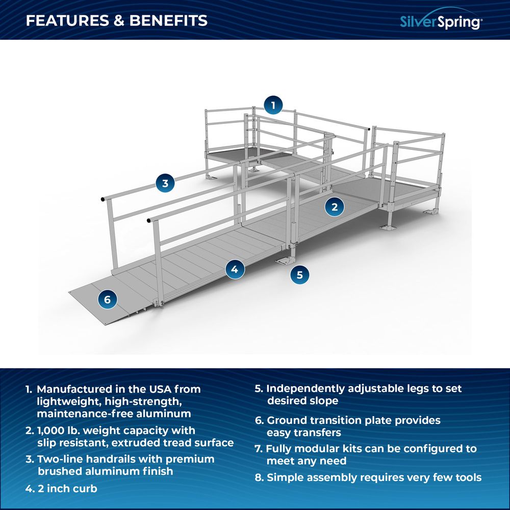 Built for easy setup, the Silver Spring Clearway Modular Ramp System ships rapidly and assembles with fewer tools than other modular systems. Manufactured in the United States from high-strength, lightweight aluminum that will never rust or require painting, it includes everything you need for installation straight out of the box. Use it to overcome rises with a slope range from 1:6 to 1:14, perfect for home entryways and similar residential applications.