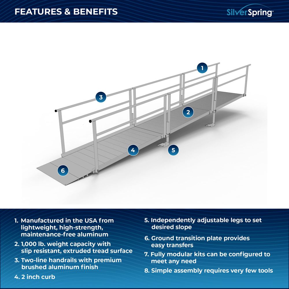 Built for easy setup, the Silver Spring Clearway Modular Ramp System ships rapidly and assembles with fewer tools than other modular systems. Manufactured in the United States from high-strength, lightweight aluminum that will never rust or require painting, it includes everything you need for installation straight out of the box. Use it to overcome rises with a slope range from 1:6 to 1:14, perfect for home entryways and similar residential applications.