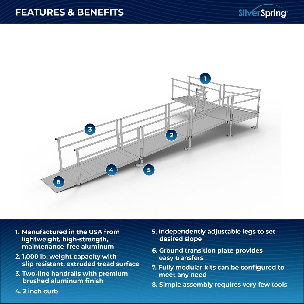 Built for easy setup, the Silver Spring Clearway Modular Ramp System ships rapidly and assembles with fewer tools than other modular systems. Manufactured in the United States from high-strength, lightweight aluminum that will never rust or require painting, it includes everything you need for installation straight out of the box. Use it to overcome rises with a slope range from 1:6 to 1:14, perfect for home entryways and similar residential applications.