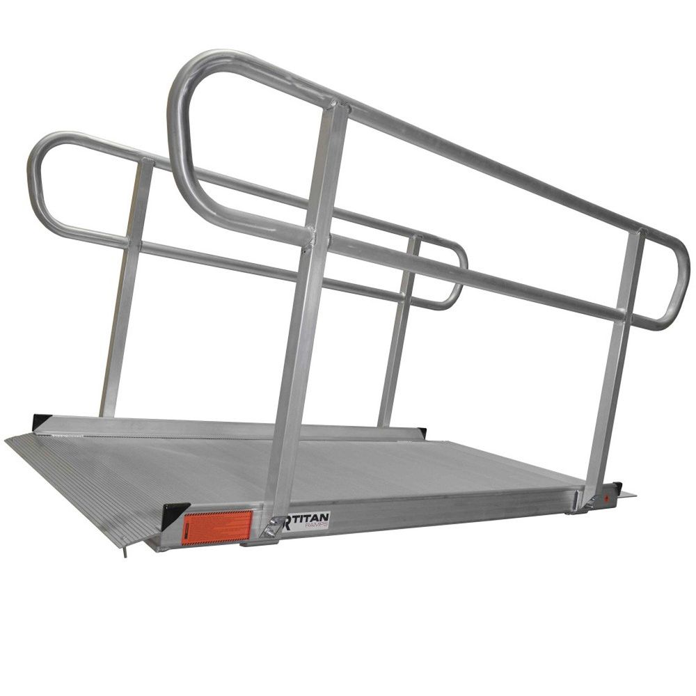 The Titan Ramps 6' Wheelchair Entry Ramp with Handrails is the perfect solution for a semi-permanent access ramp at your home or small business! Carefully designed using corrosion-resistant aluminum for years of maintenance-free use makes this ramp an excellent investment. The wide design and slip resistant surface mean this ramp is ideal for wheelchairs, scooters, walkers, canes, and crutches. Feel confident with the rigid one-piece design and top lip transition plate.