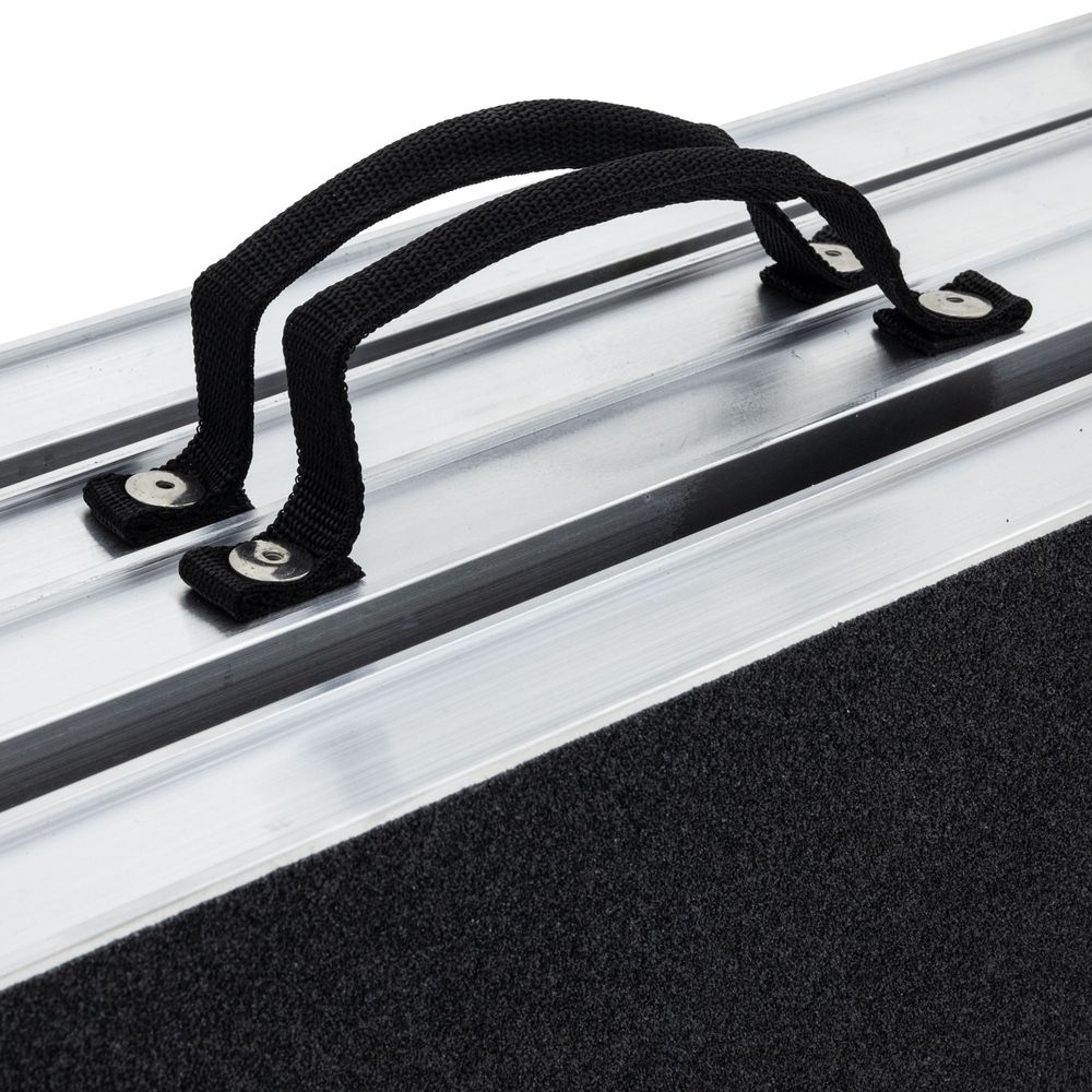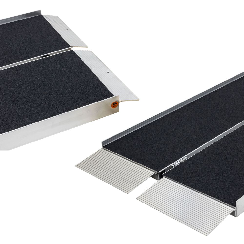 Transport and unfold the ramp to access entryways, patios, and similar areas. Designed to be highly portable, it folds down to a quarter of its size to fit easily in vehicles, garages or within the home. Pulling a safety release pin allows it to break down into two easy-to-carry pieces with built-in handles, and a hook and loop latch keeps the ramp folded when not in use.