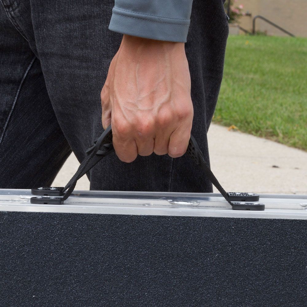 Transport and unfold the ramp to access entryways, patios, and similar areas. Designed to be highly portable, it folds down to a quarter of its size to fit easily in vehicles, garages or within the home. Pulling a safety release pin allows it to break down into two easy-to-carry pieces with built-in handles, and a hook and loop latch keeps the ramp folded when not in use.