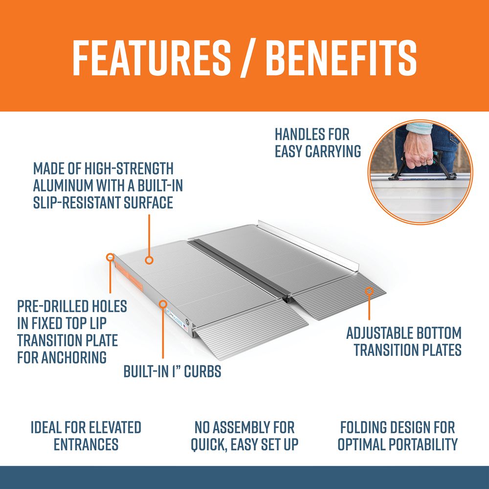 This ramp is manufactured from high-strength, lightweight aluminum so it will never rust or need regular maintenance. The convenient and portable design gives you quick accessibility on the go with integrated flexible carrying handles and the bottom transition plates adjust to accommodate uneven terrains.