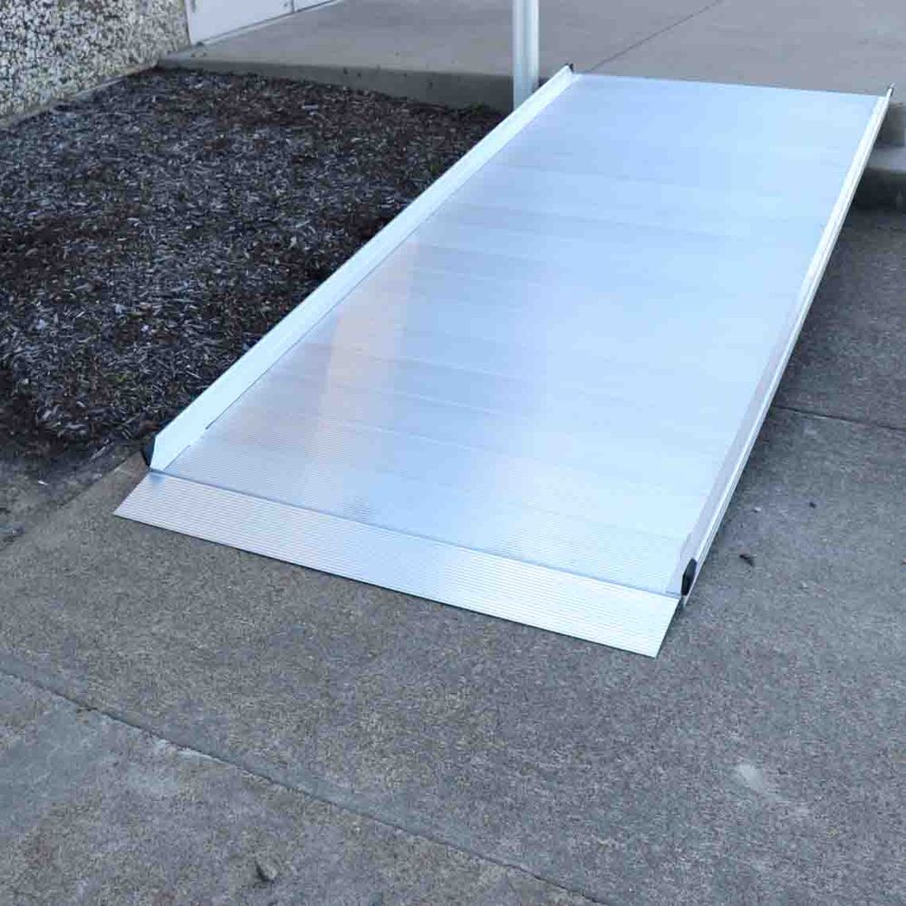 The Titan Ramps 6' x 48" Aluminum Wheelchair Entry Ramp is the perfect solution for a semi-permanent access ramp to your home or commercial business. These ramps are carefully designed using corrosion-resistant aluminum for years of maintenance free use, making these entry ramps an excellent investment. The 48" W design complies with the Massachusetts and California Building Code. The ramps feature a slip resistant surface which is ideal for wheelchairs, scooters, walkers, canes, and crutches. These solid ramps also have a top lip transition plate, allowing the transfer from the ramp to the raised surface effortless. The 6’ ramp should be used on surfaces no more than 6” high to comply with Americans with Disabilities Act (ADA). The bottom flexible transition lip allows for an easy ramp to ground transfer. There is no hardware in the usable ramp area, avoiding any tripping hazard.