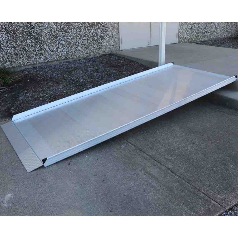 The Titan Ramps 9' 6" x 48" Aluminum Wheelchair Entry Ramp is the perfect solution for a semi-permanent access ramp to your home or commercial business. These ramps are carefully designed using corrosion-resistant aluminum for years of maintenance-free use, making these entry ramps an excellent investment. The 48” wide design complies with the Massachusetts and California Building Codes. The ramps feature a slip-resistant surface which is ideal for wheelchairs, scooters, walkers, canes, and crutches. These solid ramps also have a top lip transition plate, allowing the transfer from the ramp to the raised surface effortless. The 10’ ramp should be used on surfaces no more than 10” high to comply with the Americans with Disabilities Act (ADA). The bottom flexible transition lip allows for an easy ramp to ground transfer. There is no hardware in the usable ramp area, avoiding any tripping hazard. The handrails are sold separately.