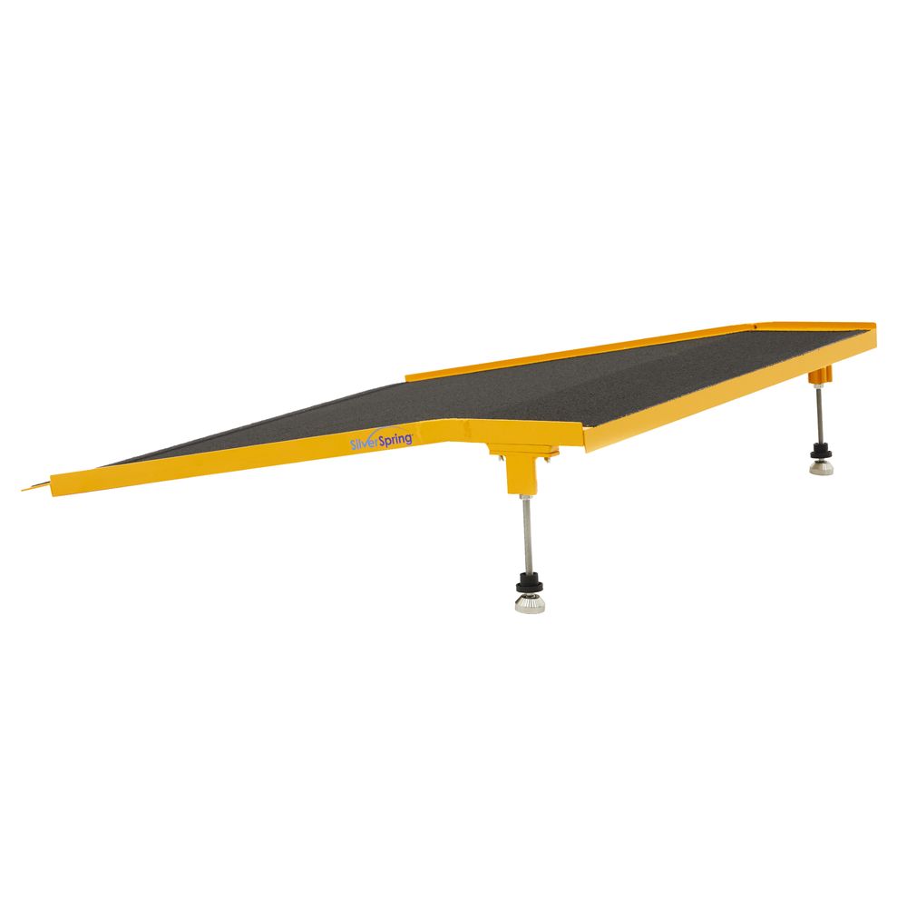 Easily overcome a step or other rises with the 30” L Silver Spring Aluminum Adjustable Threshold ramp. This ramp comes with stainless steel legs and threaded screws that enable you to adjust the height of the ramp from 5.5" to 9".