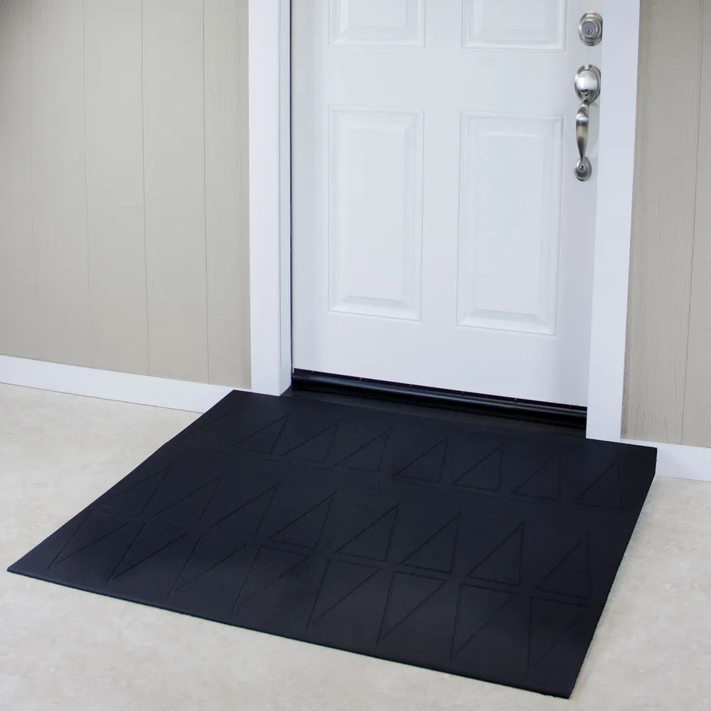 Manufactured from 100% recycled rubber, it has excellent slip-resistance and grooves for excess water to sluice off. Attractive and durable, this ramp will last for years and provide easy mobility for foot traffic as well as wheelchair or mobility scooter traffic. This ramp is made up of four lightweight pieces that are easy to handle and position.